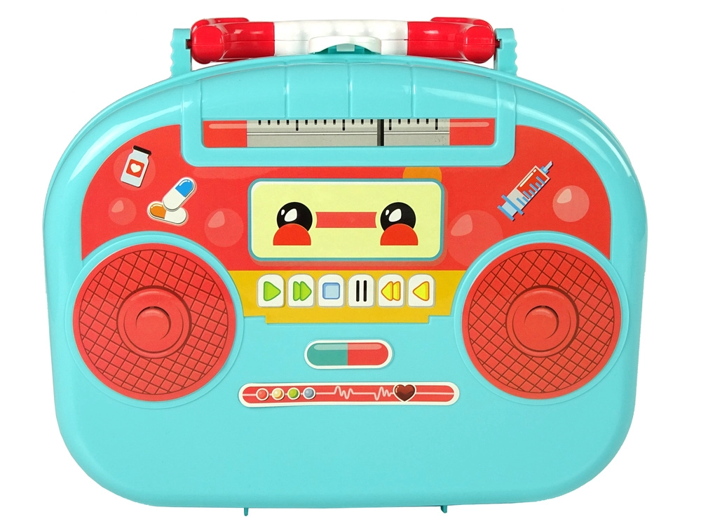 Walizeczka w figlarnym kształcie z „głośnikami” i nadrukiem przycisków pobudza wyobraźnię i nadaje roli lekarza nowy wymiar.