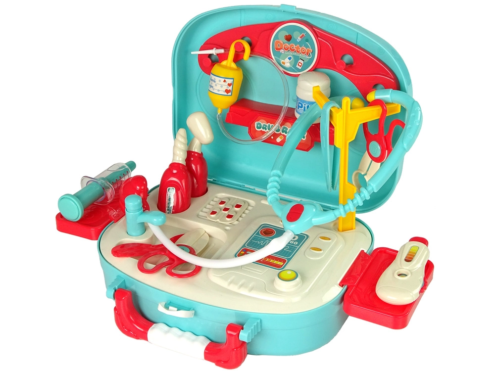Zabawny i edukacyjny zestaw lekarski dla dzieci w praktycznej turkusowej walizeczce wspiera wyobraźnię, naukę oraz przełamywanie lęku przed lekarzem. Zawiera stetoskop, strzykawkę, termometr, nożyczki i inne akcesoria o bezpiecznych, zaokrąglonych kształtach. Idealny prezent dla małych lekarzy od 3 lat.