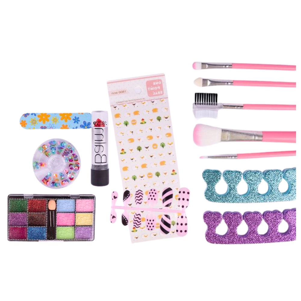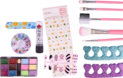 Paletka cieni, zabawkowa pomadka, pędzelki, aplikatory, ozdoby do paznokci i separator palców – bogate wyposażenie do bezpiecznej, twórczej zabawy.