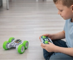 Sterowanie za pomocą pilota RC rozwija koordynację, refleks i precyzję ruchów. Auto umożliwia jazdę do przodu/do tyłu, w lewo/w prawo, pełne obroty 360° oraz odwróconą jazdę po obu stronach nadwozia – idealne do akrobatycznych popisów bez przerw.