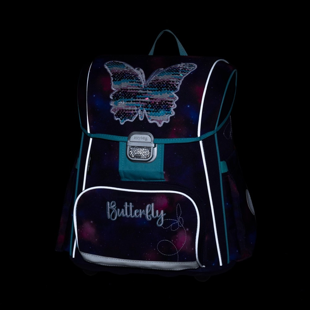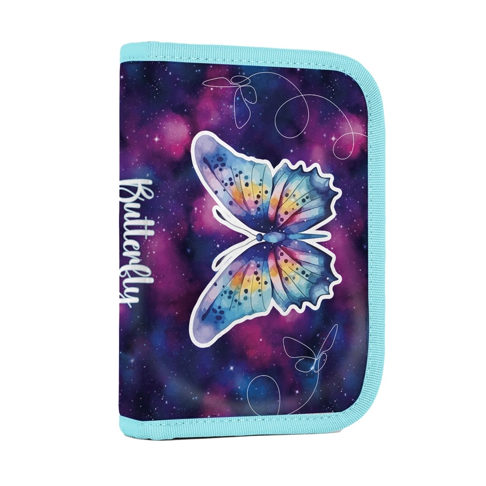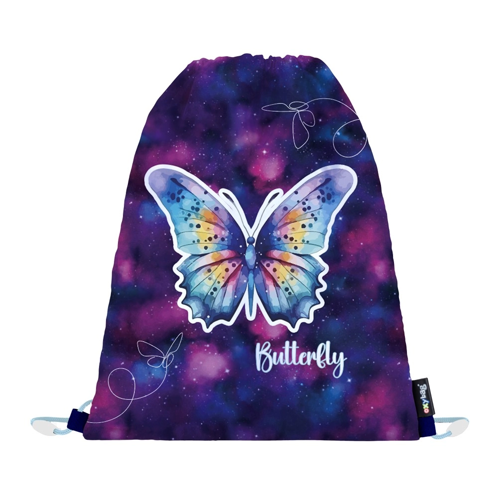 Komplet uzupełnia lekki worek na strój gimnastyczny lub obuwie ze ściąganymi sznurkami oraz przejrzysty jednopoziomowy piórnik z dwiema klapkami i gumkami na przybory. Na wewnętrznej klapce piórnika znajduje się przezroczysta folia na plan lekcji – wszystko w atrakcyjnym motywie z motylami.