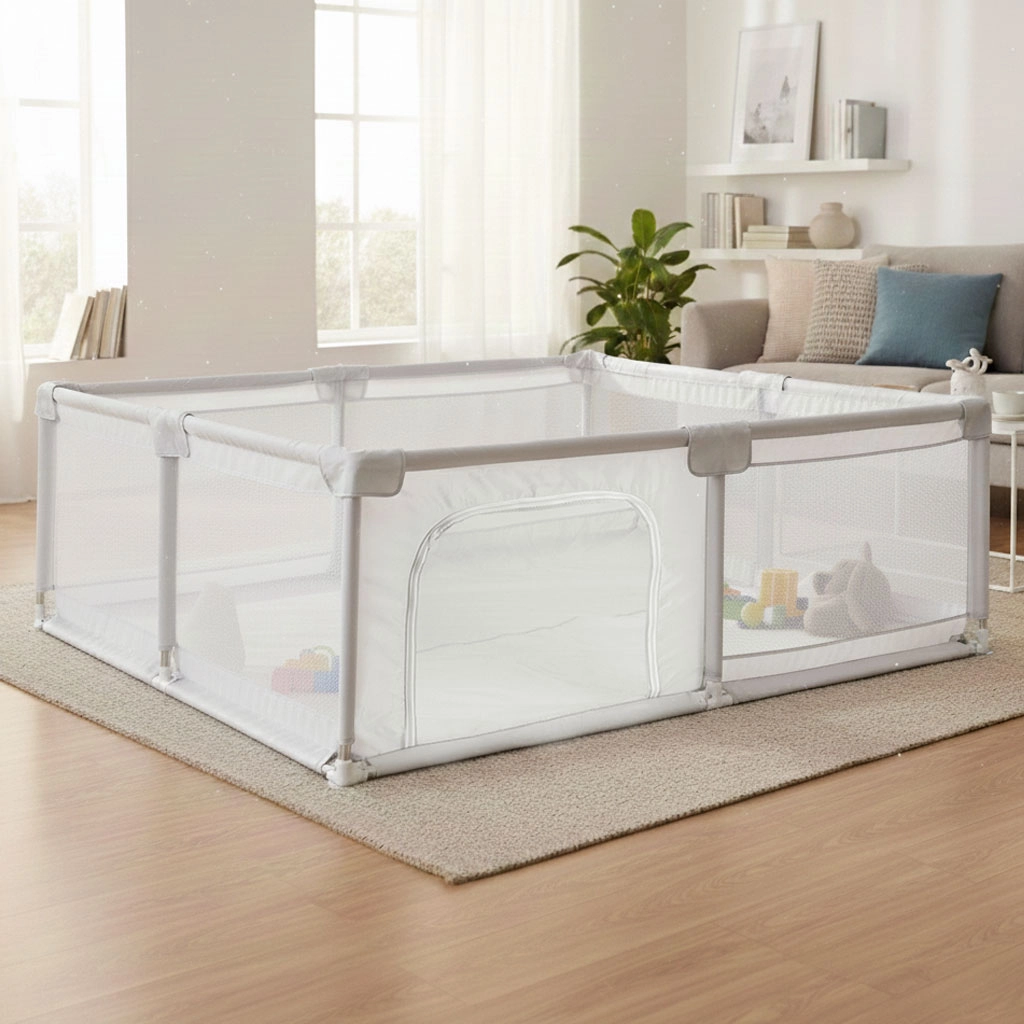 Przezroczyste ścianki z siatki umożliwiają stałą kontrolę i przepływ powietrza. Wejście zapinane jest zamkiem od zewnętrznej strony, więc dziecko nie otworzy go samodzielnie.
