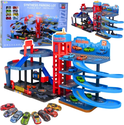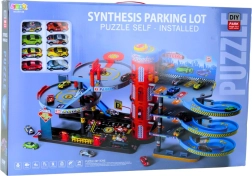 Zestaw wykonano z wytrzymałego plastiku i uzupełniono o metalowe autka z kołami z wolnym biegiem. Zabawa parkingiem rozwija koordynację oko–ręka, wyobraźnię przestrzenną oraz organizację ruchu. Dzięki naklejkom dzieci mogą spersonalizować garaż według własnych pomysłów.