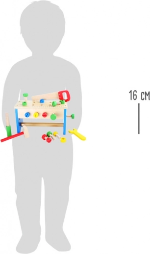 W komplecie znajduje się pełny zestaw narzędzi – śrubokręt, klucz, młotek i piła – wraz z kolorowymi śrubami i nakrętkami do nieskończonych kombinacji przykręcania. Zabawa wspiera zdolności koordynacyjne, logiczne myślenie i cierpliwość.