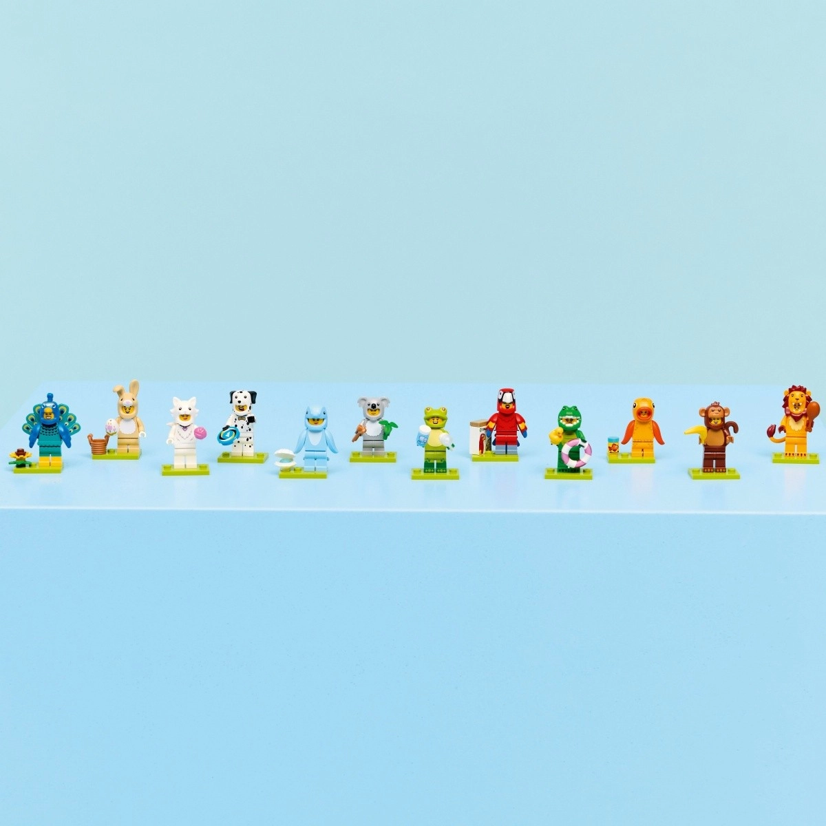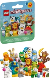 W serii znajdziesz postacie w kostiumach: papuga, lew, żaba, krokodyl, dalmatyńczyk, złota rybka, uroczy króliczek, paw, mięciutki kot, koala, delfin i małpa. Każda figurka jest ukryta w zapieczętowanym tajemniczym boxie, więc niespodzianka jest gwarantowana – zbierz wszystkie 12 minifigurek i rozbuduj swoją ekspozycję LEGO lub świat zabawy.