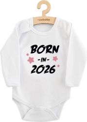Urocze bawełniane body z długim rękawem marki New Baby z nadrukiem Born in 2026 ucieszy każdego maluszka. Wykonane w 100% z bawełny, posiada certyfikowane barwniki odpowiednie dla niemowląt oraz praktyczne zapięcie na napy na ramieniu i między nóżkami, co ułatwia ubieranie i przewijanie. Certyfikat OEKO-TEX Standard 100 gwarantuje bezpieczeństwo i delikatność dla wrażliwej skóry.
