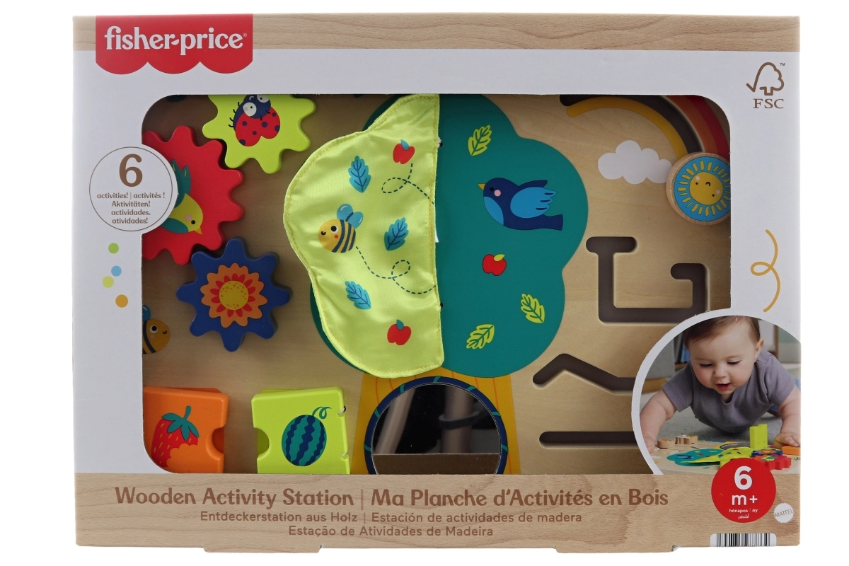 Interaktywna drewniana tablica sensoryczna Fisher-Price Ogródek oferuje 6 aktywności sensorycznych dla najmłodszych. Dzieci ćwiczą małą motorykę, percepcję sensoryczną oraz myślenie logiczne. Wykonana z drewna z certyfikatem FSC i malowana nietoksycznymi farbami na bazie wody. Odpowiednia od 6 miesięcy.