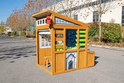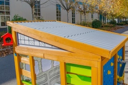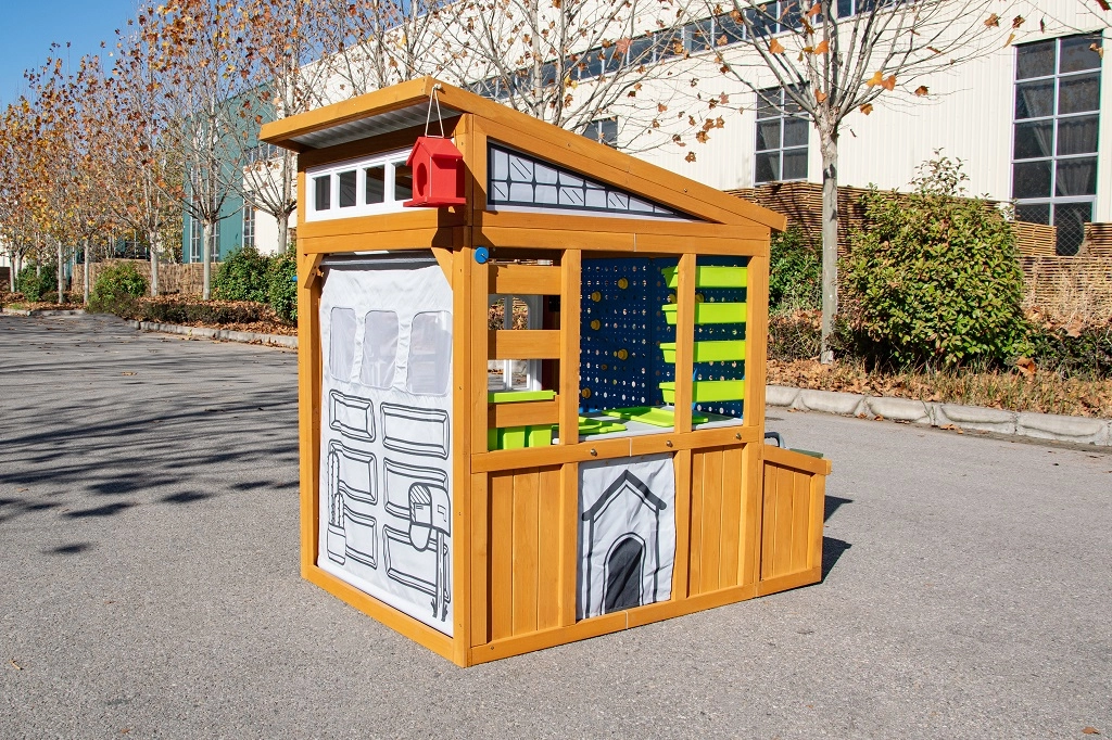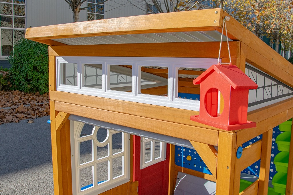 Rolowane „garażowe” drzwi z klamką, wytrzymała ławeczka o nośności 100 kg oraz detale, takie jak karmnik dla ptaków i skrzynka okienna, łączą zabawę z otaczającą przyrodą.