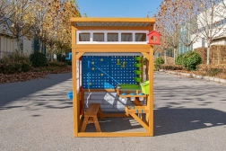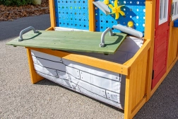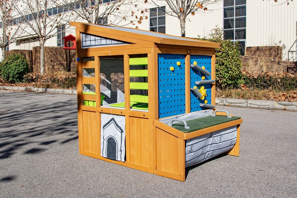 Ogrodowy domek Hobby Workshop zamieni Twój ogród w bezpieczne i stymulujące miejsce zabaw. Solidna drewniana konstrukcja z dwuspadowym dachem przypomina mały warsztat i zachęca do pomysłowej zabawy. Dzieci pokochają otwieranie i zamykanie rolowanych drzwi z klamką, eksperymentowanie na ścianie kołkowej oraz pracę przy podwyższonym stole z praktycznym blatem.