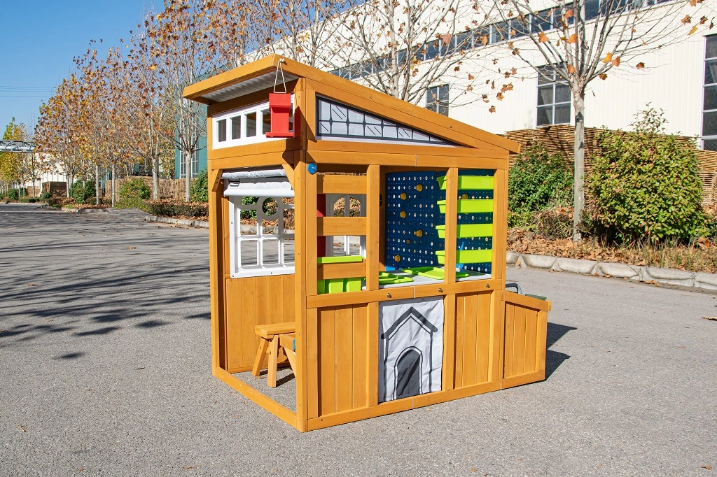 Daj dzieciom przestrzeń do odkrywania, konstruowania i tworzenia. Ten drewniany ogrodowy domek z elementami warsztatowymi oferuje ścianę kołkową, stół roboczy oraz rolowane „garażowe” drzwi. Dzięki sprytnemu systemowi przechowywania, ławeczce i dodatkom, takim jak karmnik dla ptaków czy skrzynka okienna, wspiera kreatywność, wyobraźnię i wspólną zabawę wielu dzieci w ogrodzie.