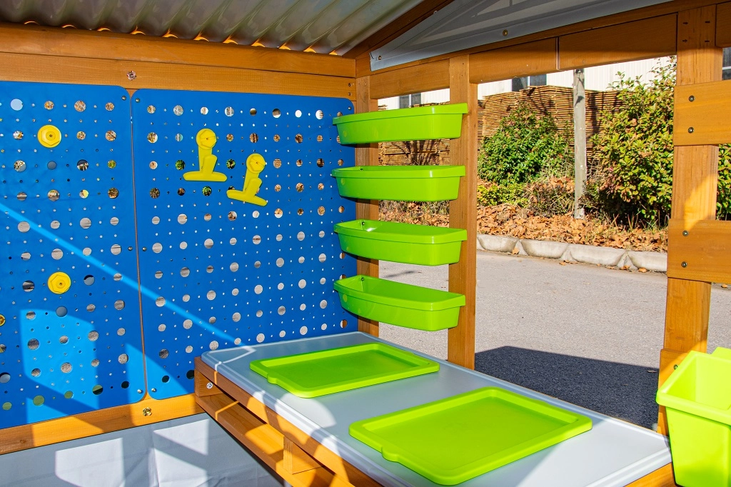- Kreatywne elementy STEM – ściana kołkowa i przestrzeń robocza do badań i tworzenia.