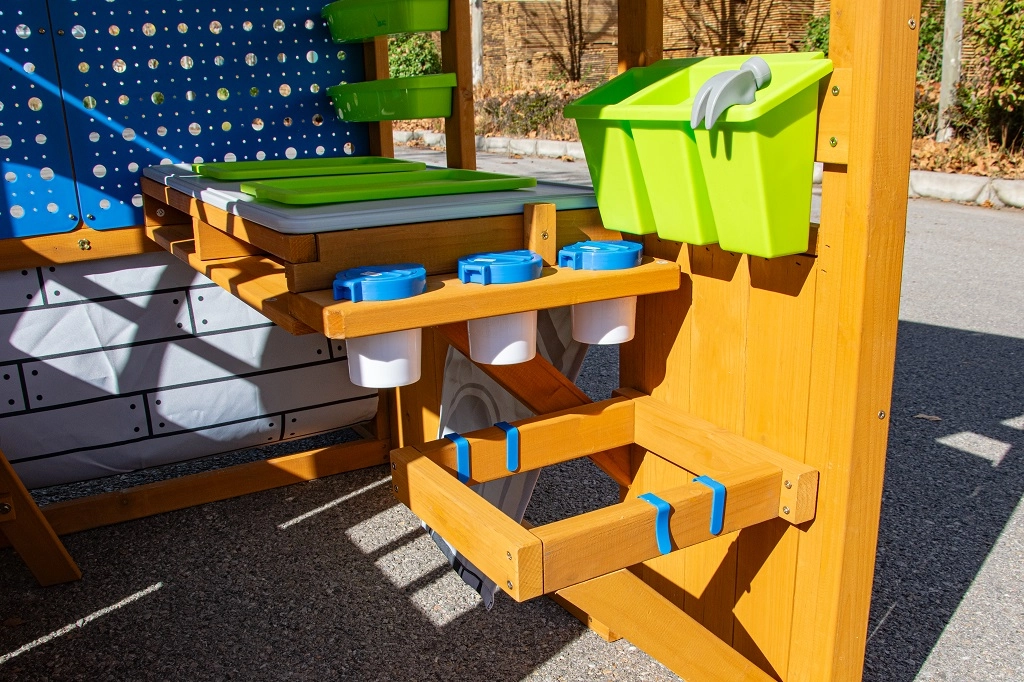 Podwyższony stół z blatem roboczym, półkami, koszami i kubeczkami utrzyma narzędzia i materiały zawsze pod ręką. Dzieci uczą się organizacji i samodzielności podczas tworzenia i doświadczeń.