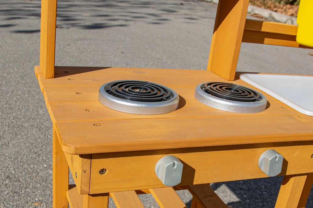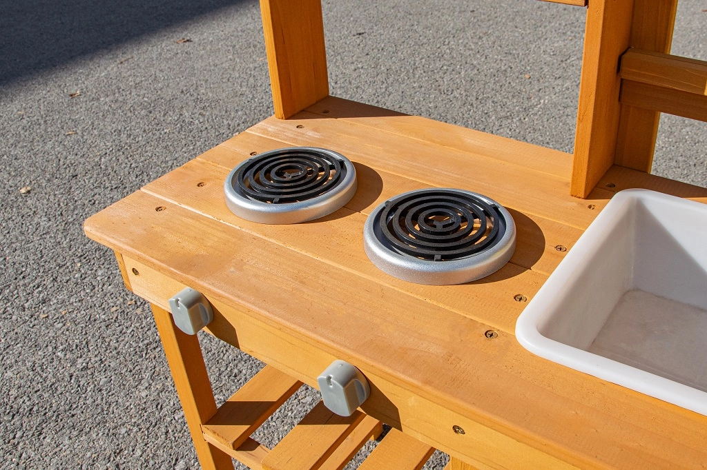 Rozwijaj dziecięcą wyobraźnię na świeżym powietrzu dzięki tej wysokiej jakości drewnianej kuchni ogrodowej. Oferuje plastikowy zlewozmywak z możliwością zabawy wodą, dwie płyty grzewcze z obrotowymi pokrętłami, zbiornik na wodę z kranem oraz przestronne otwarte półki do przejrzystego przechowywania wszystkiego, co potrzebne. Wytrzymała konstrukcja i sprytne rozplanowanie wspierają zabawę w gotowanie, kreatywność oraz samodzielność dzieci.
