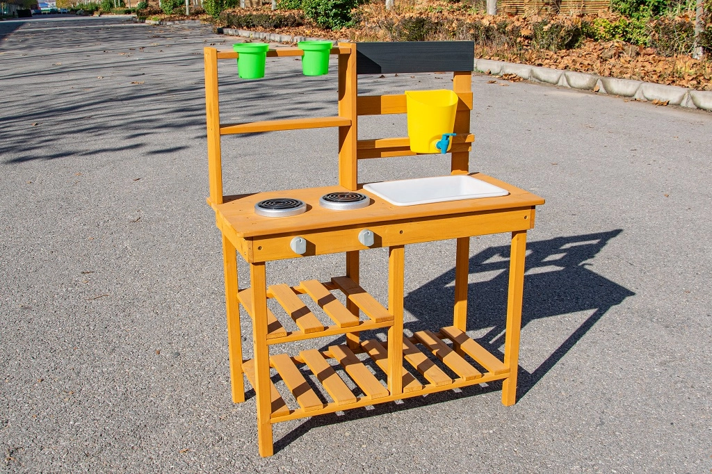Ta zewnętrzna kuchnia dla dzieci jest idealna do aktywności typu „mud kitchen” oraz klasycznej zabawy w gotowanie. Solidna, drewniana konstrukcja jest łatwa w utrzymaniu i oferuje stabilny blat roboczy z dwoma palnikami, plastikowym zlewozmywakiem oraz praktycznymi haczykami i uchwytami na akcesoria. Zbiornik z kranem umożliwia bezpieczne i ciekawe eksperymenty z wodą.