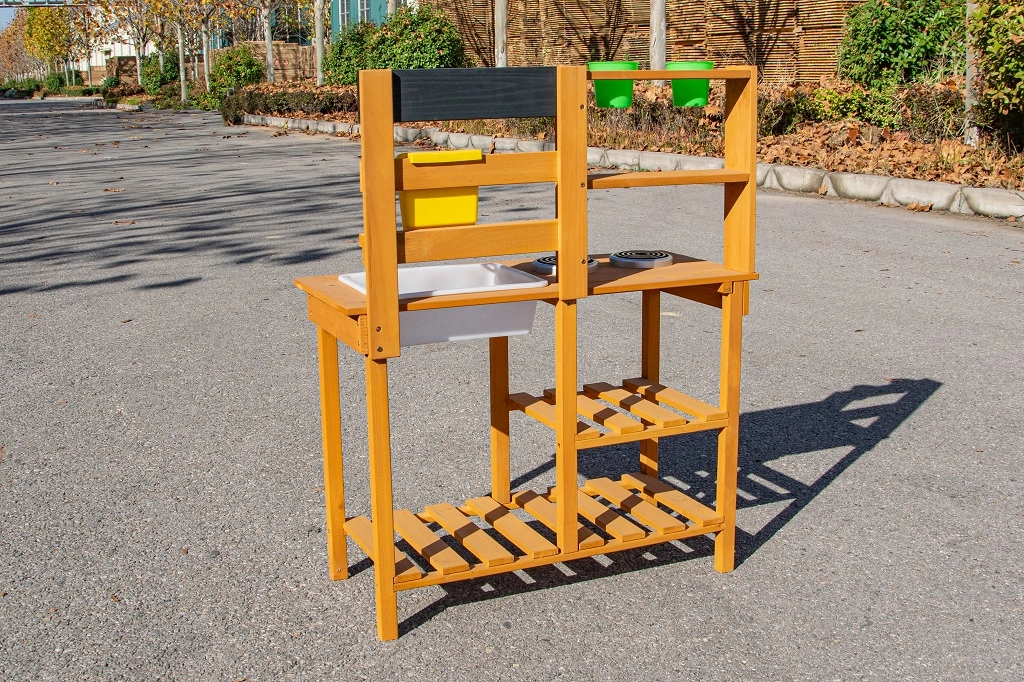 Otwarte półki i listwowe regały zapewniają dużo miejsca na garnki, miski i „składniki” z natury. Dzięki kompaktowym wymiarom kuchnia zmieści się na balkonie, tarasie i w ogrodzie. Świetnie sprawdzi się do wspólnej zabawy rodzeństwa i przyjaciół, rozwija motorykę małą, wyobraźnię oraz umiejętności społeczne.