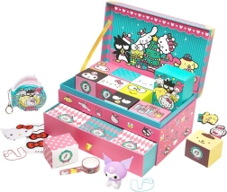 W środku znajdziesz barwną mieszankę małych zabawek i tematycznych dodatków – breloczki do kluczy, naklejki, papierowe dekoracje, mini figurki i inne urocze drobiazgi w duchu HELLO KITTY. Przemyślane pakowanie w osobnych pudełeczkach potęguje radość z codziennego odkrywania. Dolna wysuwana szuflada dodatkowo oferuje miejsce na kolejne skarby.