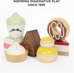 Wprowadź do dziecięcych zabaw słodką atmosferę dzięki eleganckiemu drewnianemu stojakowi na ciasta LE TOY VAN. Ten wysokiej jakości dodatek do dziecięcej kuchni oferuje trzy poziomy do serwowania, 7 drobiazgowo wykonanych drewnianych deserów i jest wykonany z certyfikowanego drewna FSC malowanego nietoksyjnymi farbami wodnymi. Jest bezpieczny dla dzieci, bez plastiku i wspiera kreatywność, wyobraźnię oraz motorykę małą.