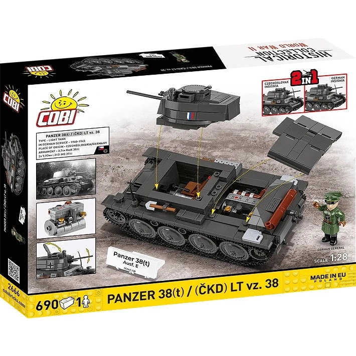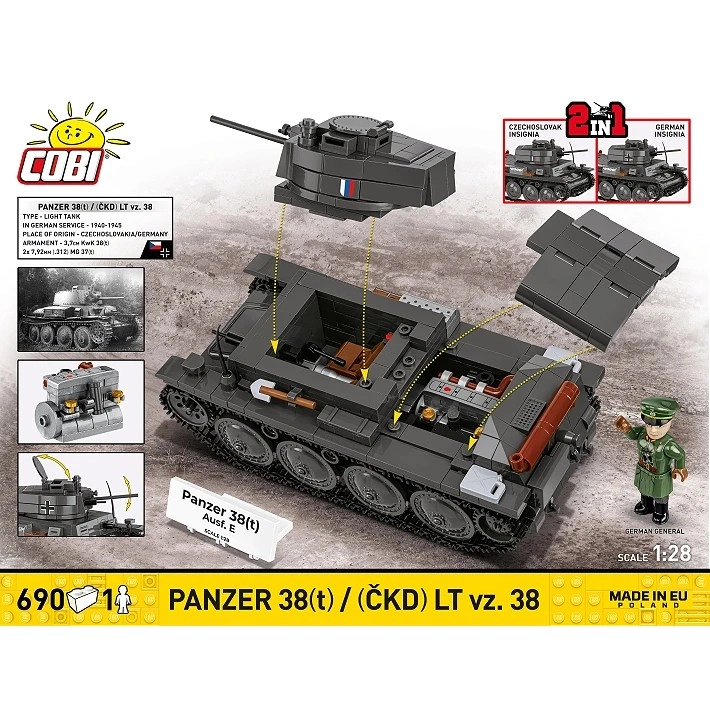 Zbuduj kultowy lekki czołg w dwóch historycznych wersjach z wysokiej jakości zestawem od COBI. Ten model 2 w 1 pozwala wybrać czechosłowacki LT vz. 38 lub jego niemiecki wariant Panzer 38(t). Ciesz się detalami w skali 1:28, realistycznymi gąsienicami, otwieranymi włazami, ruchomą armatą oraz trwałymi nadrukami. W zestawie znajduje się także minifigurka i tabliczka kolekcjonerska.
