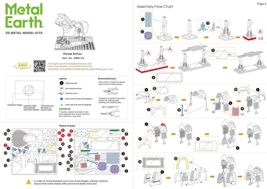 Wyjmij elementy z metalowych blaszek (polecane małe cęgi tnące), połącz je za pomocą zamków z wypustkami i doginaj cienkimi szczypcami. Stopniowo zmontuj wszystkie połączenia, tworząc realistyczny model końskiej zbroi.