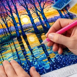 Stwórz własny, lśniący obraz techniką diamentowego malowania. Dzięki wstępnie nadrukowanemu płótnu i czytelnej legendzie będziesz łatwo nanosić kryształki na oznaczone miejsca, stopniowo układając mozaikę w szczegółowy motyw brzóz nad jeziorem. Ta czynność przynosi spokój, koncentrację i radość z tworzenia.
