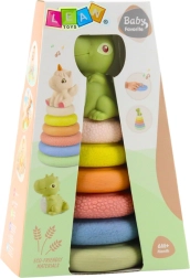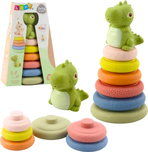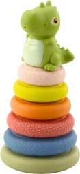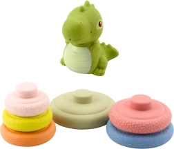 Bezpieczne wykonanie z zaokrąglonymi krawędziami i przyjemnie miękkim materiałem jest delikatne dla dziecięcych dłoni. Figurka dinozaura może być umieszczona na szczycie i po naciśnięciu wydaje piszczałkę, co motywuje do dalszego odkrywania. Eleganckie opakowanie czyni z niego świetny prezent dla niemowląt.