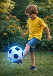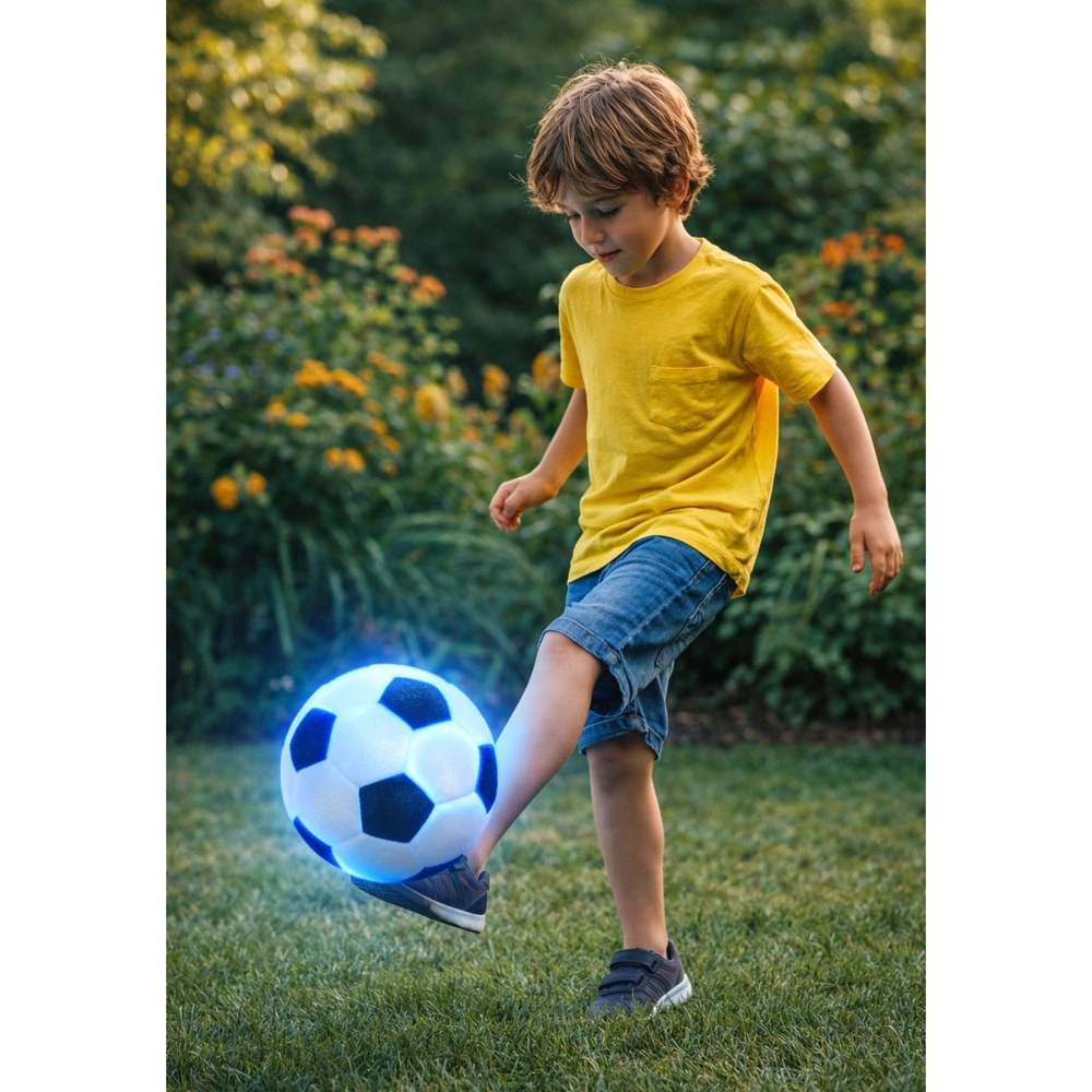 Ta dziecięca piłka nożna łączy klasyczny wygląd z nowoczesnymi efektami świetlnymi. Elastyczna guma i miękki tekstylny pokrowiec w czarno-białym wydaniu zwiększają komfort i bezpieczeństwo podczas gry. Po uderzeniu zapalają się światła LED (czerwone i niebieskie), dzięki czemu piłkę łatwiej znaleźć, a zabawa jest bardziej atrakcyjna dla dzieci.
