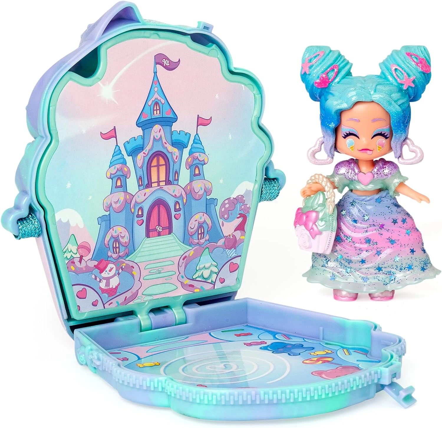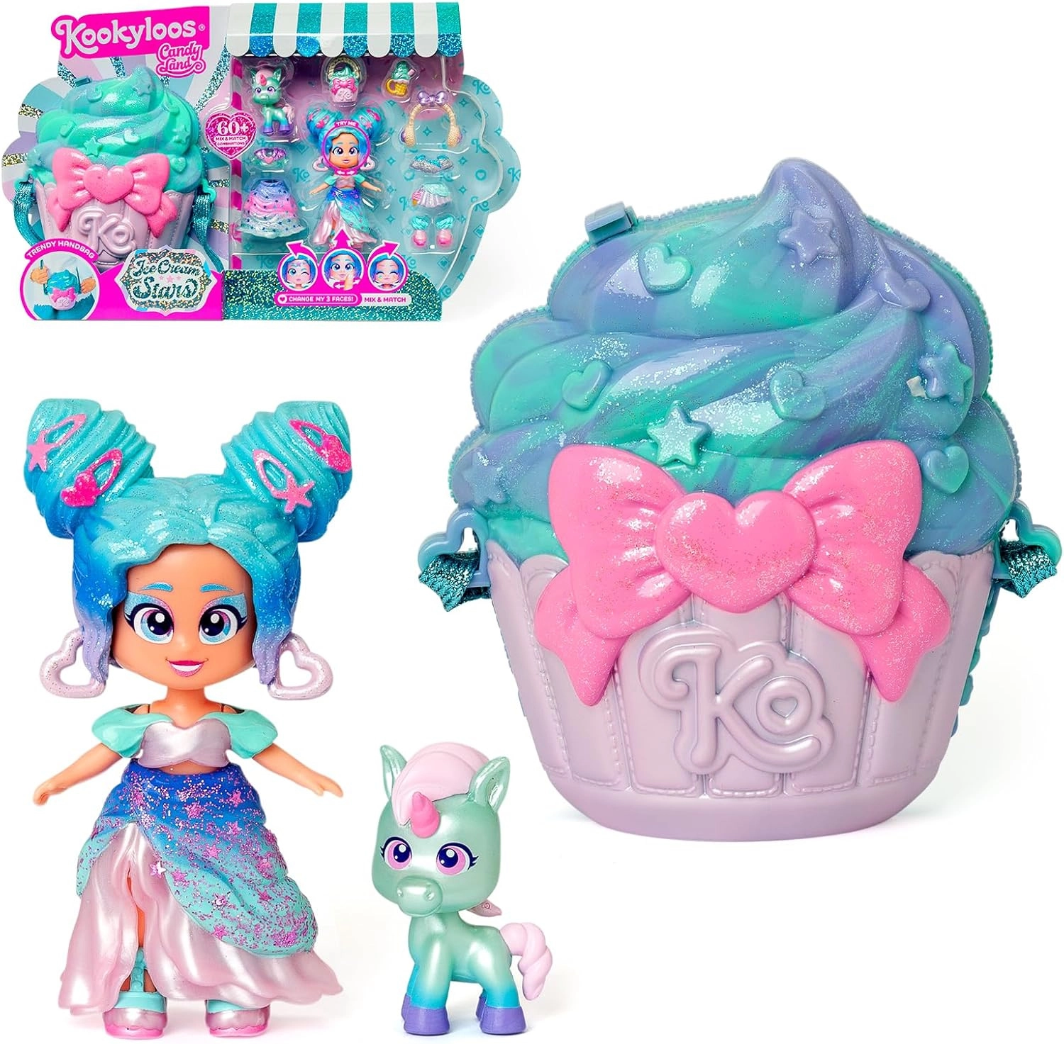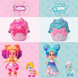 - figurka Candy Cream Stars, 3 stylizacje ubrań, 2 pary bucików, mały jednorożec, akcesorium–przekąska, torebka w kształcie babeczki