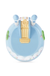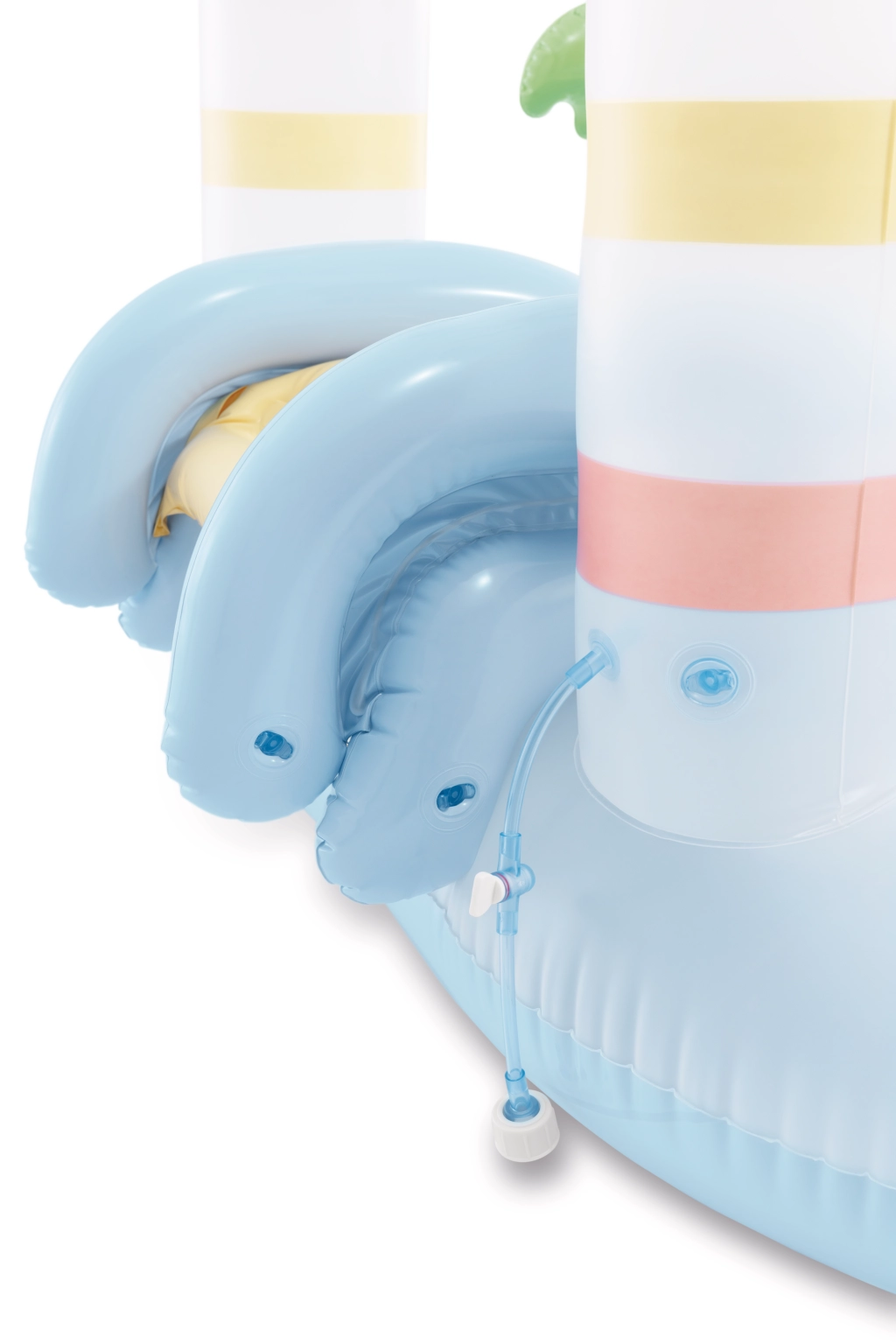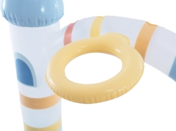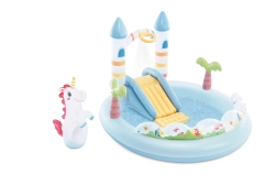 Centrum zabaw Jednorożczy zamek zapewnia dzieciom orzeźwienie i mnóstwo możliwości zabawy w jednym. Pastelowe kolory, motyw magicznego zamku i urocze ilustracje tworzą przyjemną atmosferę letniej rozrywki. Między dwiema wieżami znajduje się łuk z natryskiem – wystarczy podłączyć wąż ogrodowy, by powstało delikatne chłodzenie podczas zabawy.
