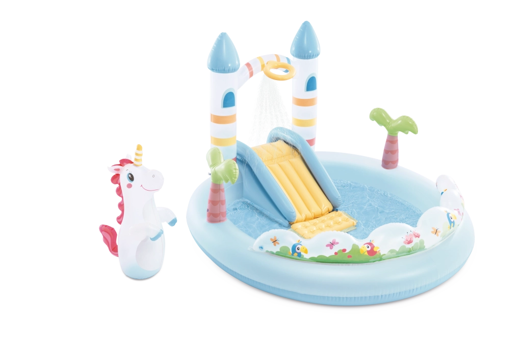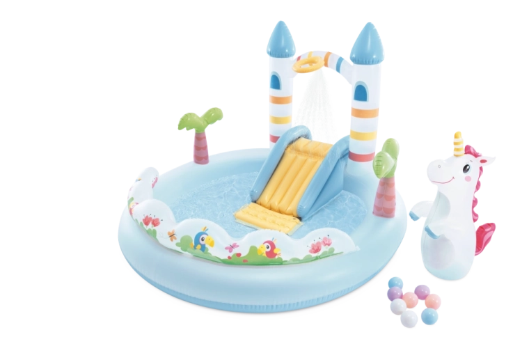 Zamień swój ogród w bajkowe miejsce dzięki centrum zabaw Jednorożczy zamek – nadmuchiwanemu wodnemu zestawowi dla dzieci od 2 lat. Oferuje płytki basenik, miękką zjeżdżalnię z wyściełanym lądowaniem, natrysk wodny po podłączeniu węża ogrodowego oraz zabawne dodatki, w tym dmuchanego jednorożca i kolorowe piłeczki do zabawy i rozwoju motoryki.