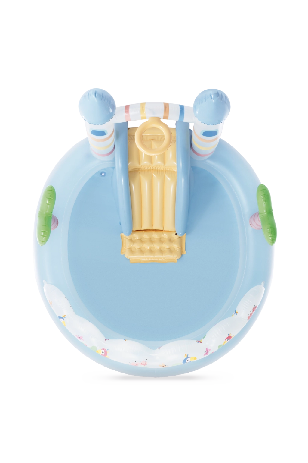 jasnoniebieski zbiornik, żółta zjeżdżalnia, kolorowe dekoracje