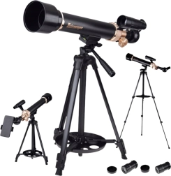 Odkryj nocne niebo z lekkim i stabilnym aluminiowym teleskopem 50/500 na statywie o wysokości do 1,35 m. Idealny dla dzieci i dorosłych do obserwacji Księżyca, jasnych planet, przyrody i krajobrazów. Wymienne okulary zapewniają powiększenie 30× i 60×, do dyspozycji jest celownik, lusterko zenitalne, uchwyt na telefon oraz bezpieczny filtr słoneczny do obserwacji Słońca po prawidłowym zamontowaniu.