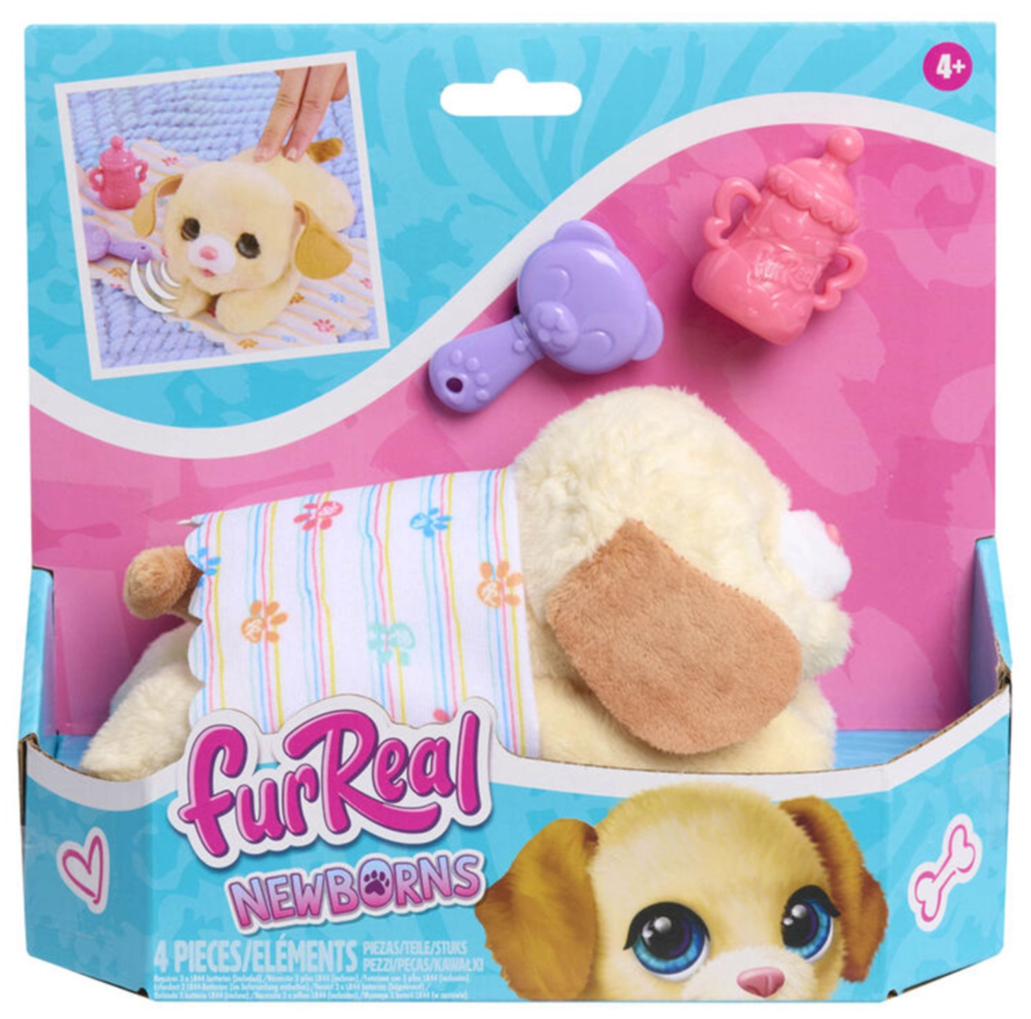 Urocze interaktywne szczeniątko FurReal Newborns pokochają wszystkie dzieci, które lubią zwierzątka. Ma mięciutkie pluszowe ciałko, duże niebieskie oczy i różowy nosek. Reaguje na głaskanie po plecach wesołymi dźwiękami, a po nakarmieniu buteleczką lub czesaniu zamyka oczy i wydaje radosne odgłosy. W zestawie znajdują się smoczek, buteleczka, szczoteczka i kocyk dla jeszcze większej troski i przytulania.