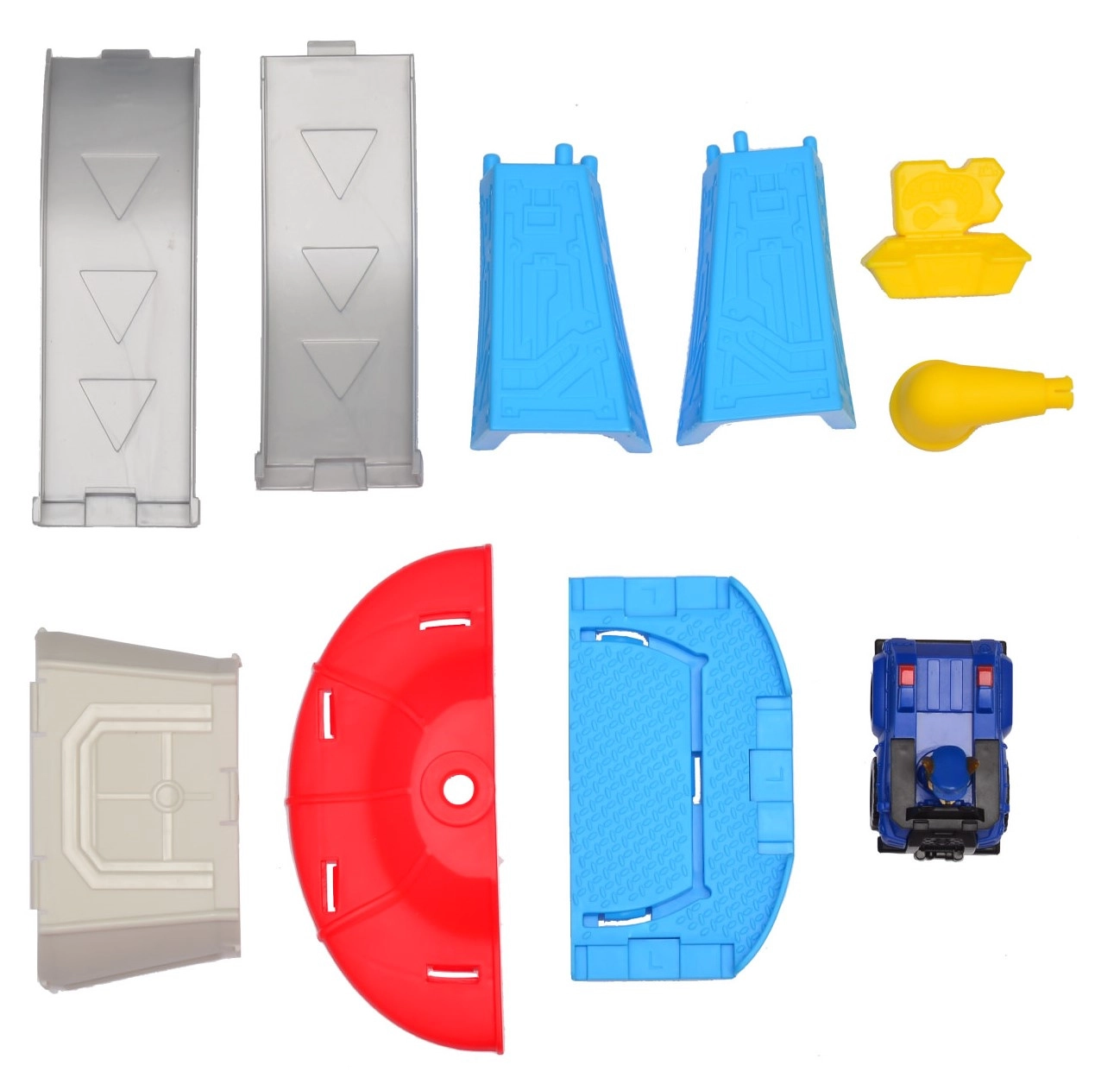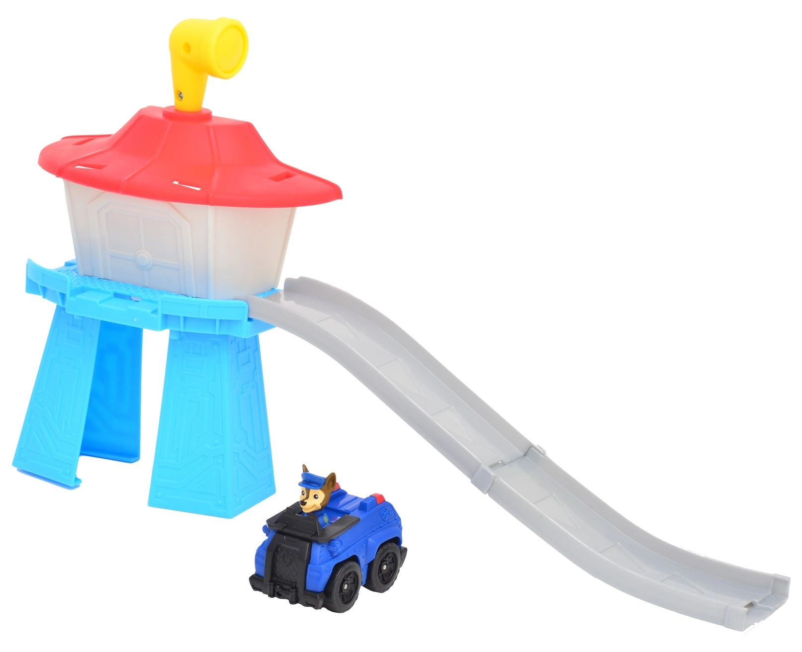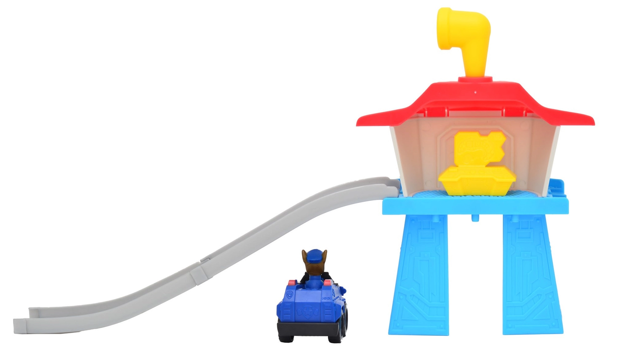 Poszczególne komponenty łatwo się wpinają. W zestawie znajduje się wieża, rampa i pojazd CHASE do natychmiastowej zabawy.