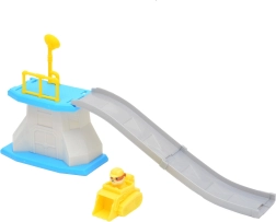 Zakrzywiona szara rampa z niebieską platformą i żółtą barierką zapewnia płynny zjazd pojazdu i mnóstwo dynamicznej zabawy.
