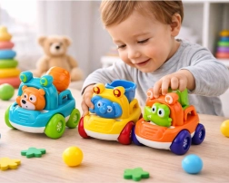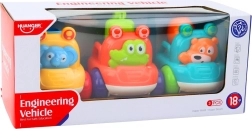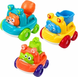 Zestaw zawiera trzy różne pojazdy budowlane: koparkę, betoniarkę i wywrotkę – każdy z sympatycznym zwierzątkiem (krokodyl, miś, słonik). Solidne, zaokrąglone kształty bez ostrych krawędzi zapewniają bezpieczny chwyt małymi rączkami, a gładkie kółka zachęcają do nieustannego jeżdżenia.