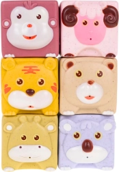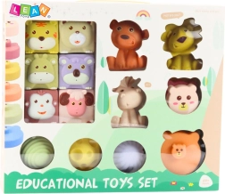 - 6× kwadratowe klocki ze zwierzątkami, 6× okrągłe elementy do budowania wieży, 3× figurki zwierząt, 3× sensoryczne piłeczki