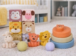 Zawiera kwadratowe klocki z motywami zwierząt, okrągłe elementy do budowania wieży, miękkie figurki do ściskania oraz sensoryczne piłeczki. Zabawki nadają się do zabawy na sucho i do kąpieli, szybko schną i łatwo je czyścić – idealne do codziennego użytkowania w domu i w podróży.