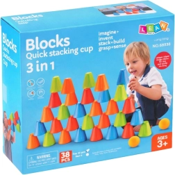 Uniwersalny zestaw dla dzieci łączy zabawę i naukę w jednym. Szybkie kubeczki 3w1 wspierają małą motorykę, logiczne myślenie i kreatywność. Dzięki staplowanym trójkątnym kubeczkom i leciutkim piłeczkom dzieci budują wieże i piramidy, trenują koordynację oraz grają w zabawne gry zręcznościowe.