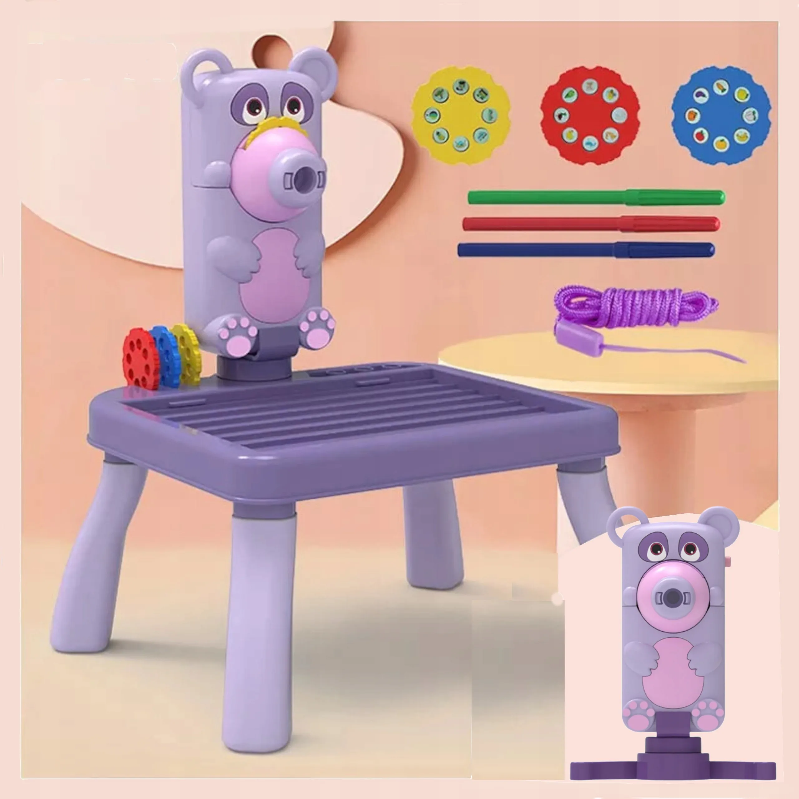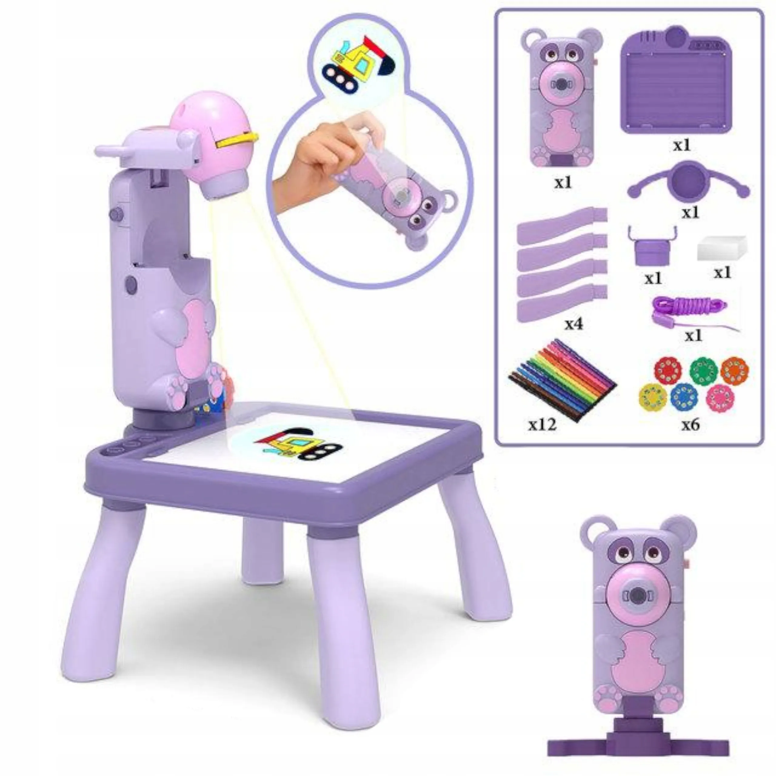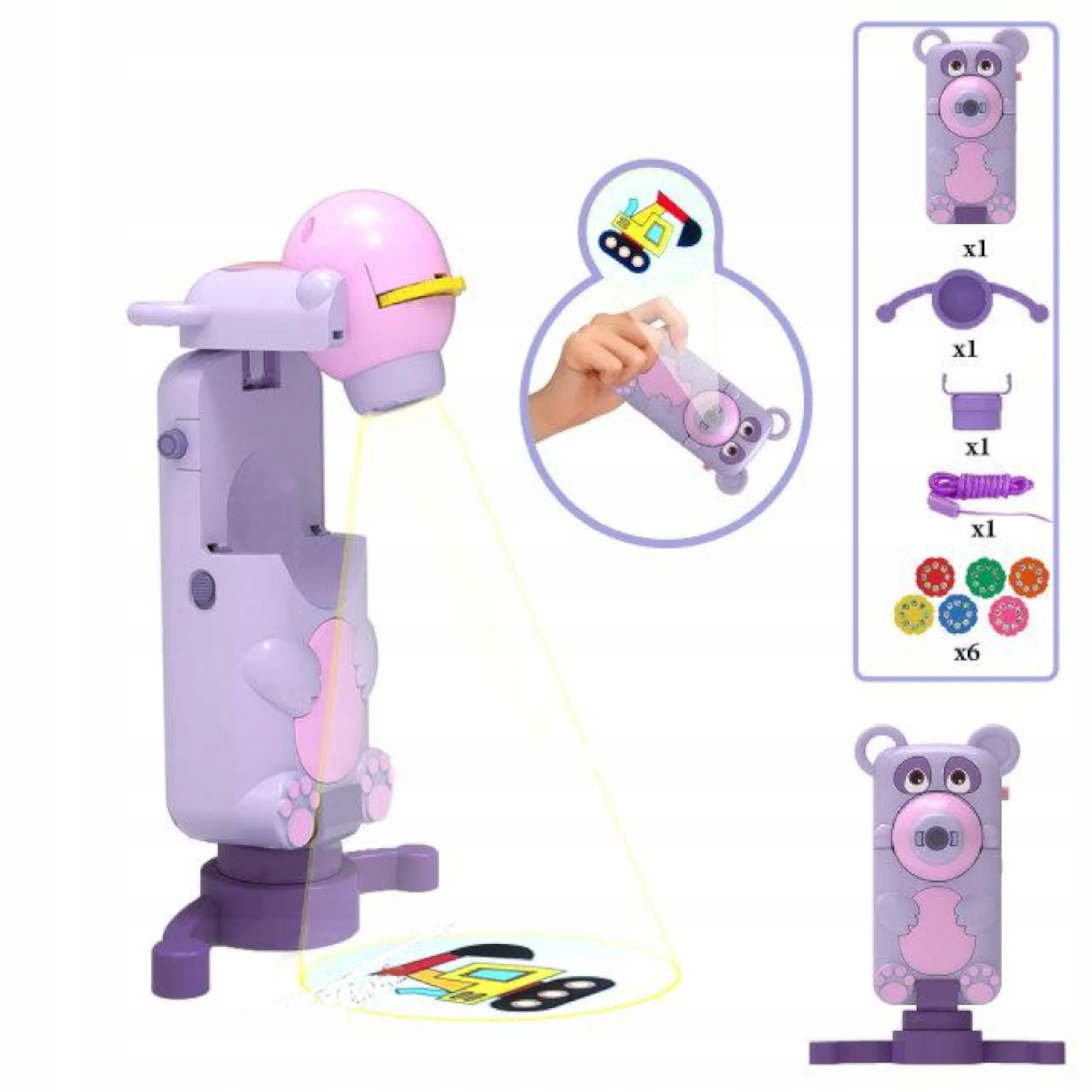 Ten dziecięcy projektor do rysowania z motywem misia to idealne narzędzie do pierwszych kroków w edukacji plastycznej. Dzieci mogą łatwo odrysowywać rzutowane obrazki z krążków z motywami zwierząt, pojazdów i dinozaurów, a jednocześnie rozwijać koordynację, cierpliwość i wyobraźnię.