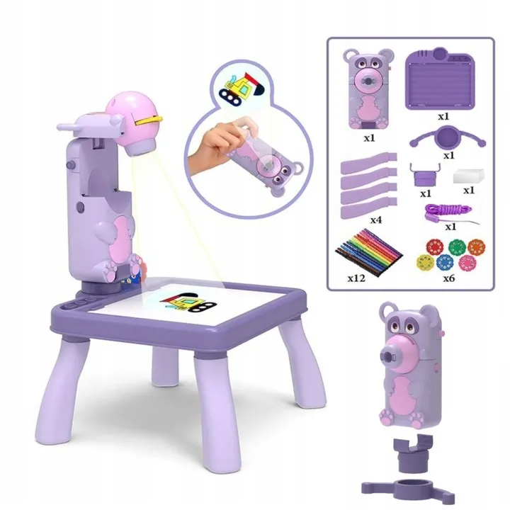 Urządzenie oferuje płynną regulację ostrości dla czystych linii, obrotową głowicę projekcyjną do rysowania na stole i rzutowania na ścianę oraz praktyczne przegródki na flamastry i krążki, które utrzymują wszystko pod ręką i w porządku. Lekka konstrukcja świetnie sprawdzi się w podróży, w pokoju dziecięcym i na odwiedzinach.