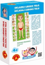 Gra Szkoła - Układaj ludzkie ciało to wspaniała gra edukacyjna, która pomaga dzieciom w zabawny sposób poznawać części ciała. Zawiera puzzle, które pozwalają dzieciom identyfikować i nazywać części jak ręka, oko, nos i inne części ciała. Każda karta ma unikalny kształt, dlatego pasuje tylko w jednym miejscu.