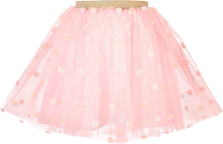 Urocza, jasnoróżowa tiulowa spódniczka dla małych dam w wieku 3–5 lat zachwyca klasycznym, rozkloszowanym krojem, elastycznym regulowanym pasem oraz delikatnymi różyczkami na wielu warstwach tiulu. Ma gładką podszewkę dla wygody oraz ozdobną złotą wstążkę w pasie – idealna na przyjęcia, karnawał, sesje zdjęciowe i codzienną zabawę.