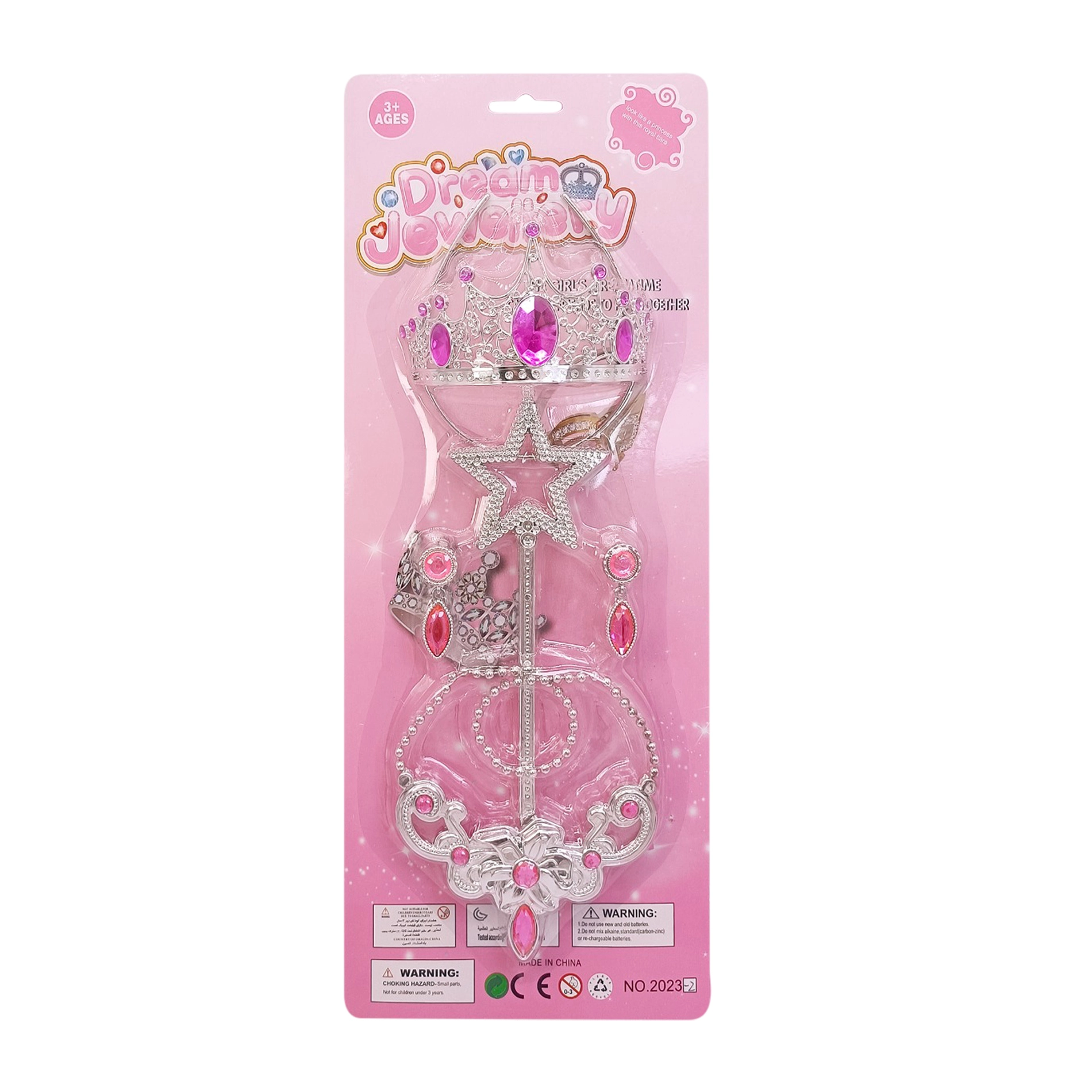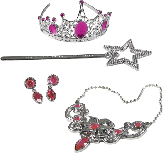 Zmień się w czarującą księżniczkę w mgnieniu oka! Ten zestaw zawiera wszystko, czego potrzeba do magicznych przebieranek: srebrną koronę, magiczną różdżkę, elegancki naszyjnik oraz błyszczące kolczyki. Różowe kryształki nadają całemu zestawowi baśniowy wygląd – idealny na karnawał, przyjęcie urodzinowe i zabawę w księżniczkę w domu.