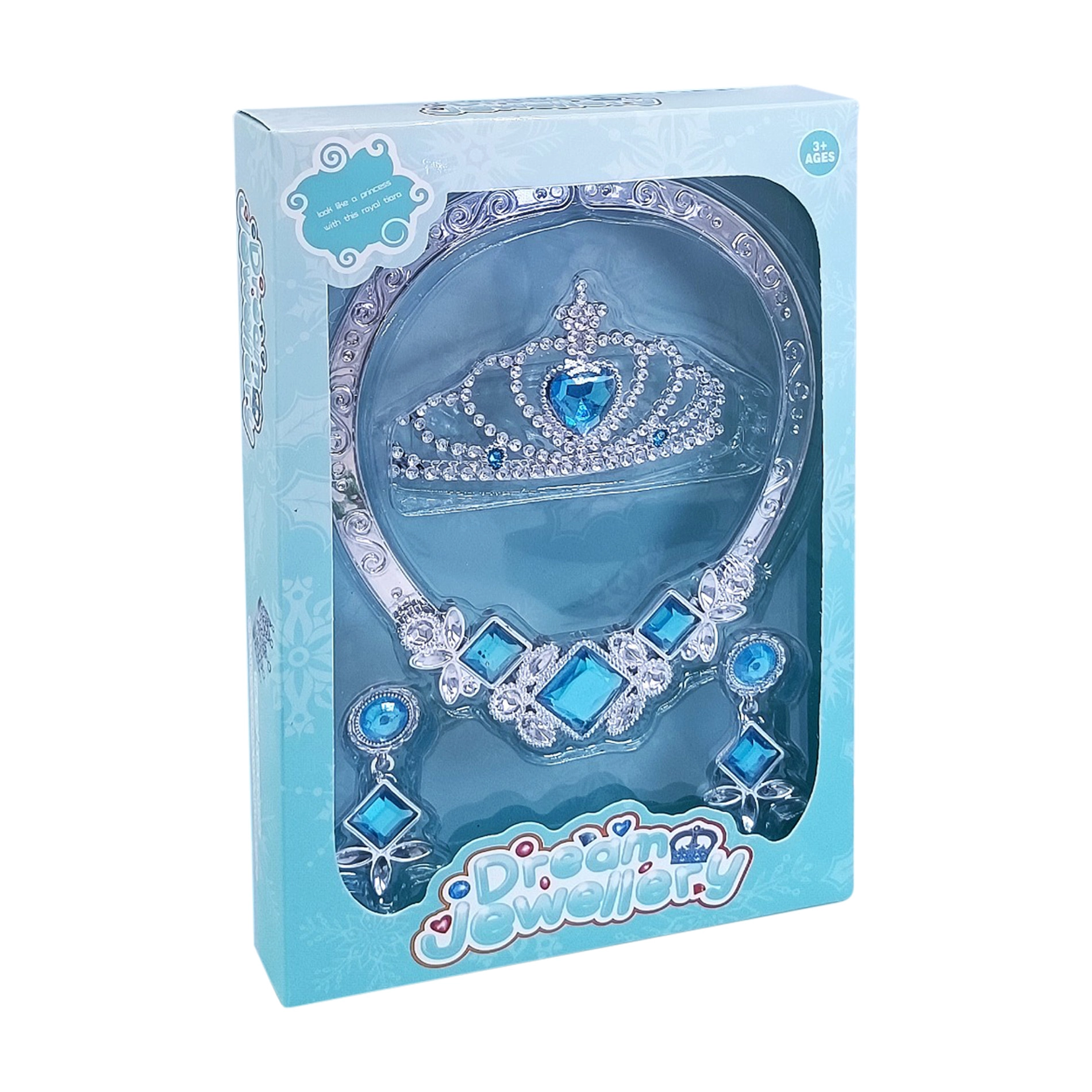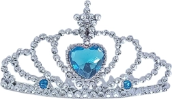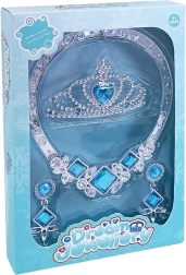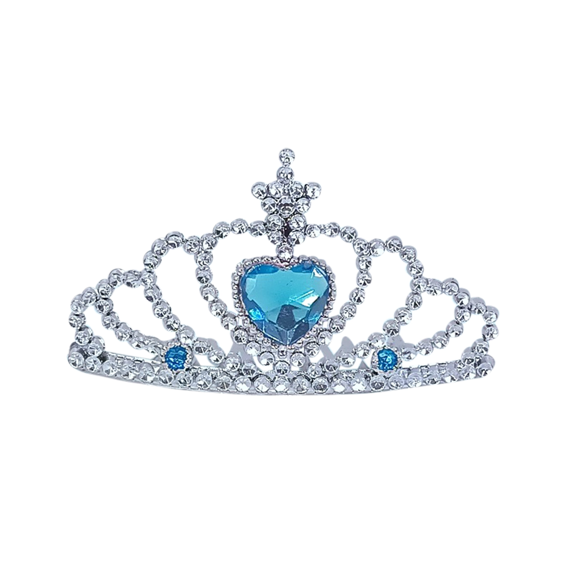 Elegancki dziecięcy zestaw akcesoriów, który w mgnieniu oka przemieni każdą małą damę w bajkową księżniczkę. Zawiera koronę, naszyjnik i kolczyki w srebrnym kolorze z lśniącymi niebieskimi kamieniami, idealny na karnawał, przyjęcia dla dzieci oraz zabawy w księżniczki.