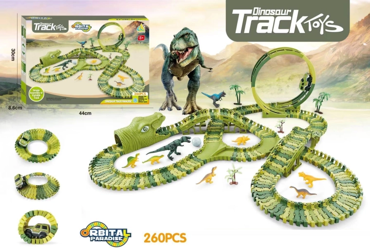 Ten kolorowy dinozaurowy tor zapewni dzieciom godziny zabawy i rozwój wyobraźni. Dzięki 260 elementom trasę można składać w różne kształty i wysokości, więc każda zabawa jest inna. W zestawie znajduje się samochodzik na baterie, który jeździ po torze i zachęca dzieci do twórczej zabawy.