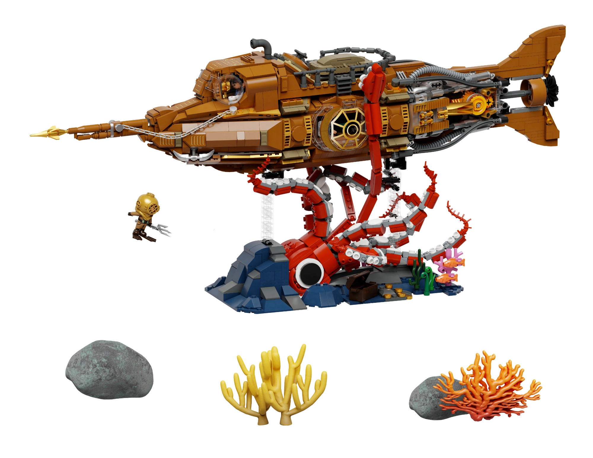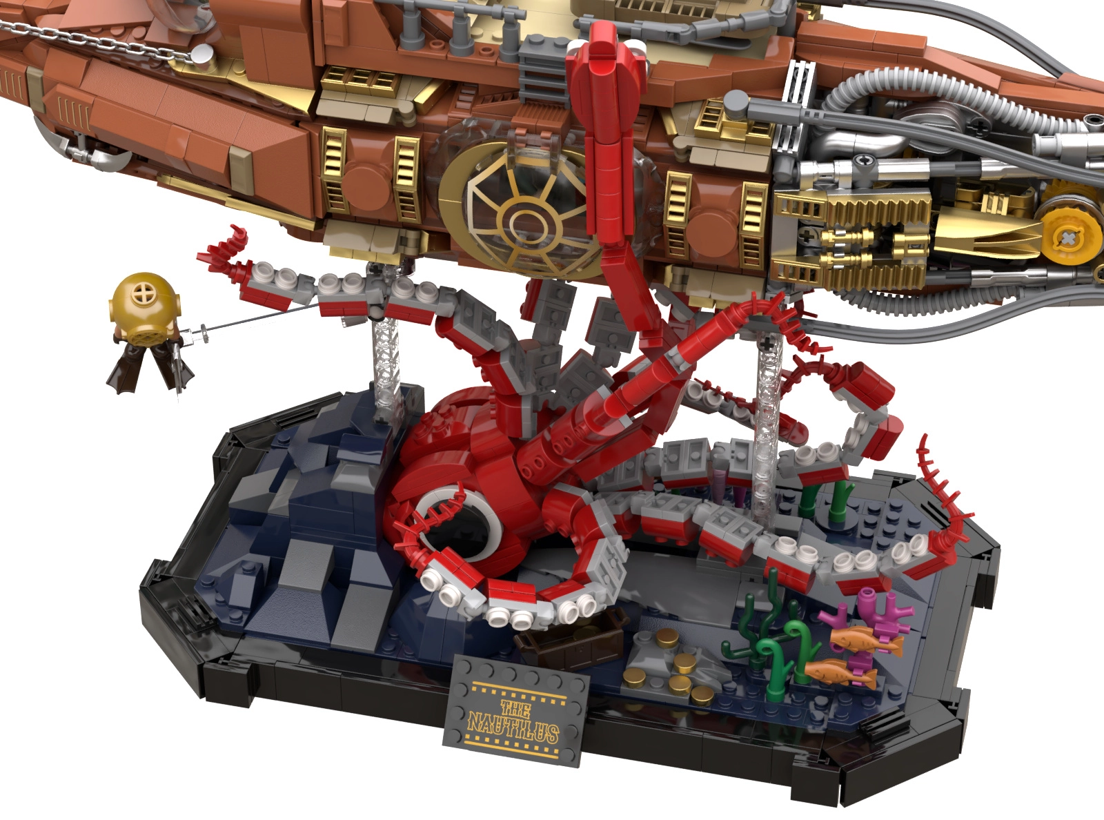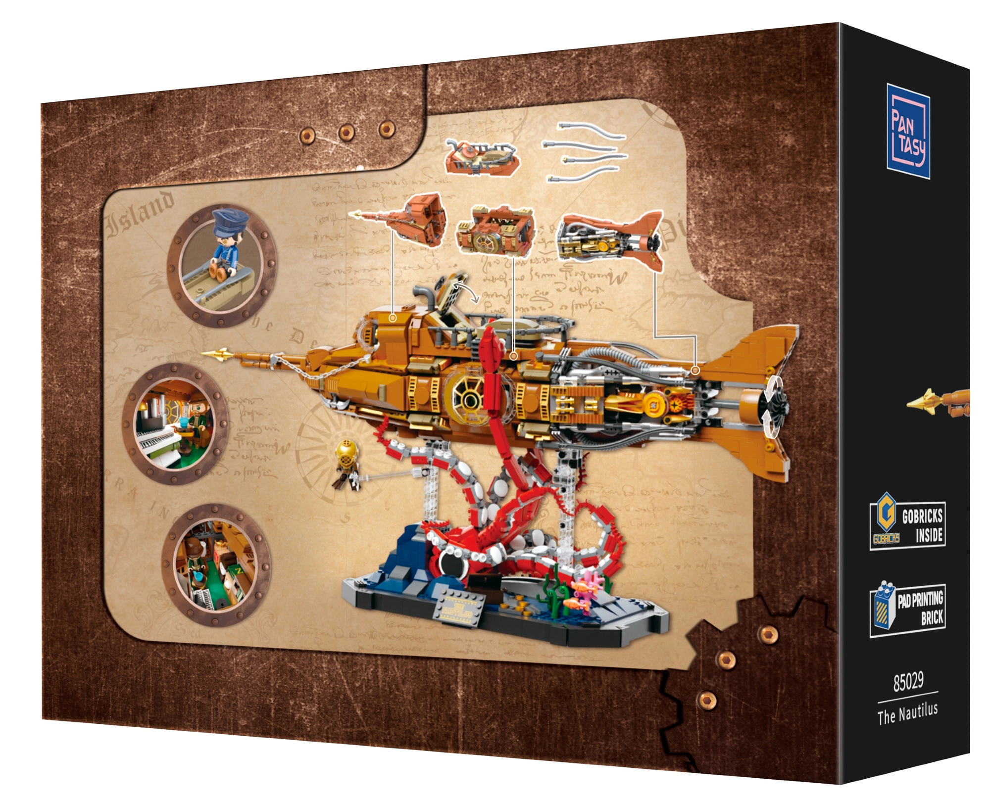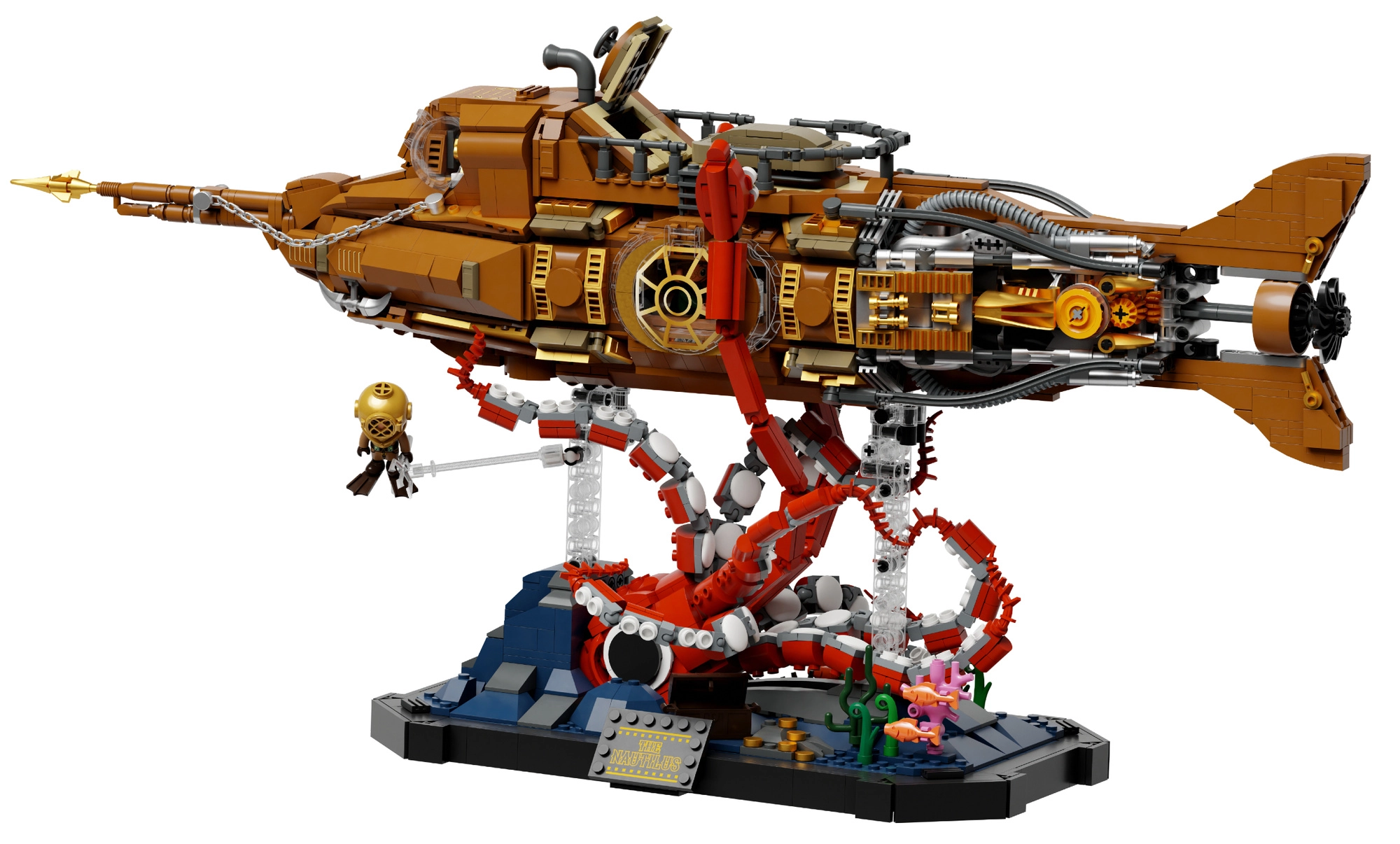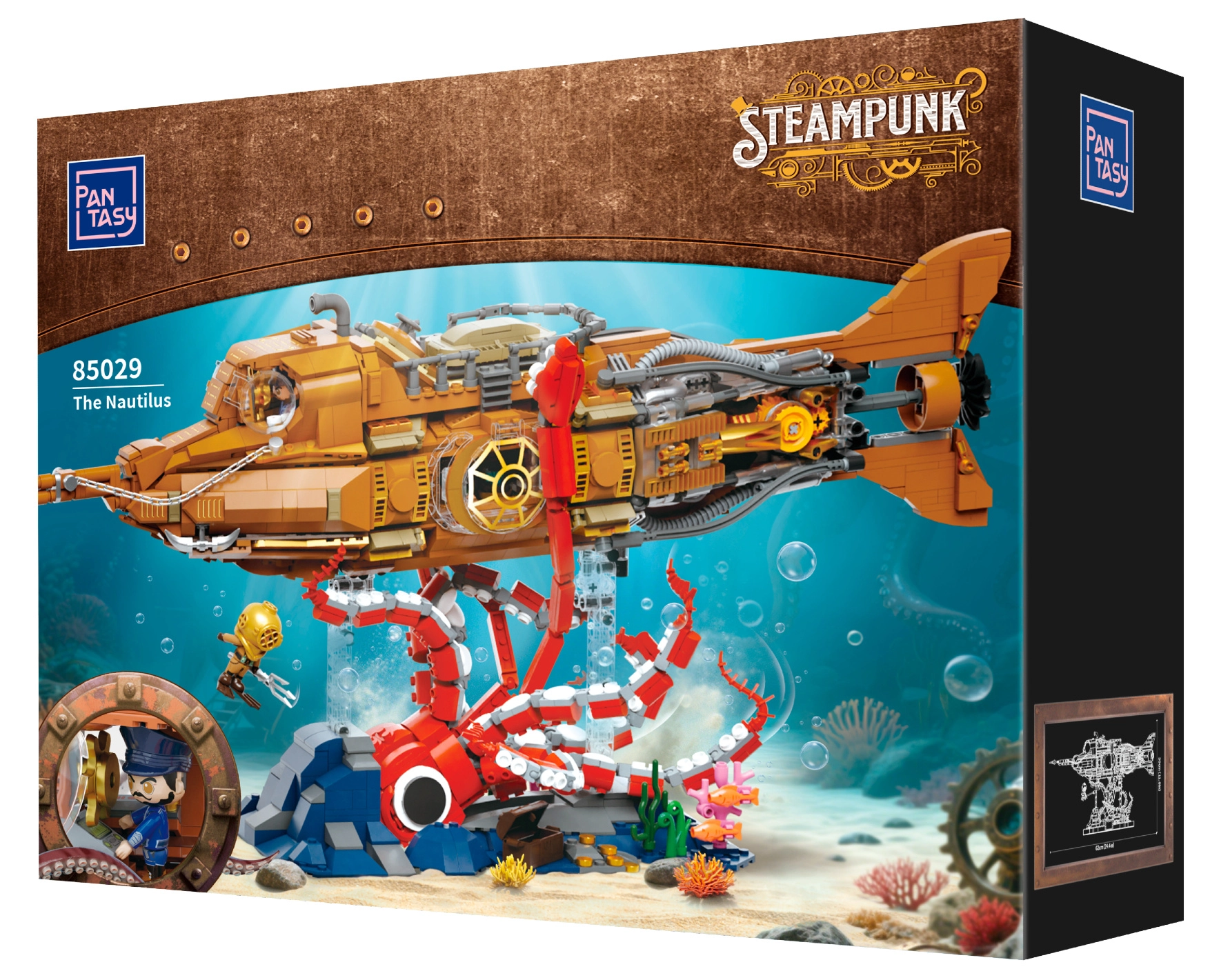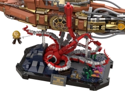 Ten kolekcjonerski model łączy precyzyjną konstrukcję i wyrazistą estetykę steampunku. Trójsekcyjny, modułowy kadłub pozwala zajrzeć do kokpitu, salonu i maszynowni, a ruchoma śruba okrętowa z przekładniami nadaje modelowi wiarygodną mechanikę. Scena na podstawie z koralowcami i atakującą ośmiornicą tworzy dynamiczny, podmorski spektakl idealny do wystawienia.