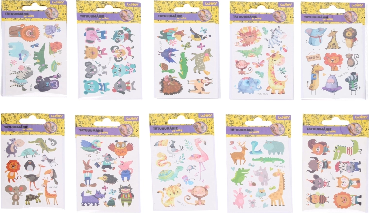 Ożyw dziecięce przyjęcia, obozy lub rodzinne weekendy wesołymi tatuażami zmywalnymi ze zwierzątkami. Dzięki praktycznemu formatowi 7,5 × 11 cm motywy łatwo przenoszą się na skórę i utrzymują się przez kilka dni. Mix uroczych zwierzęcych motywów zachwyci małych miłośników przyrody.