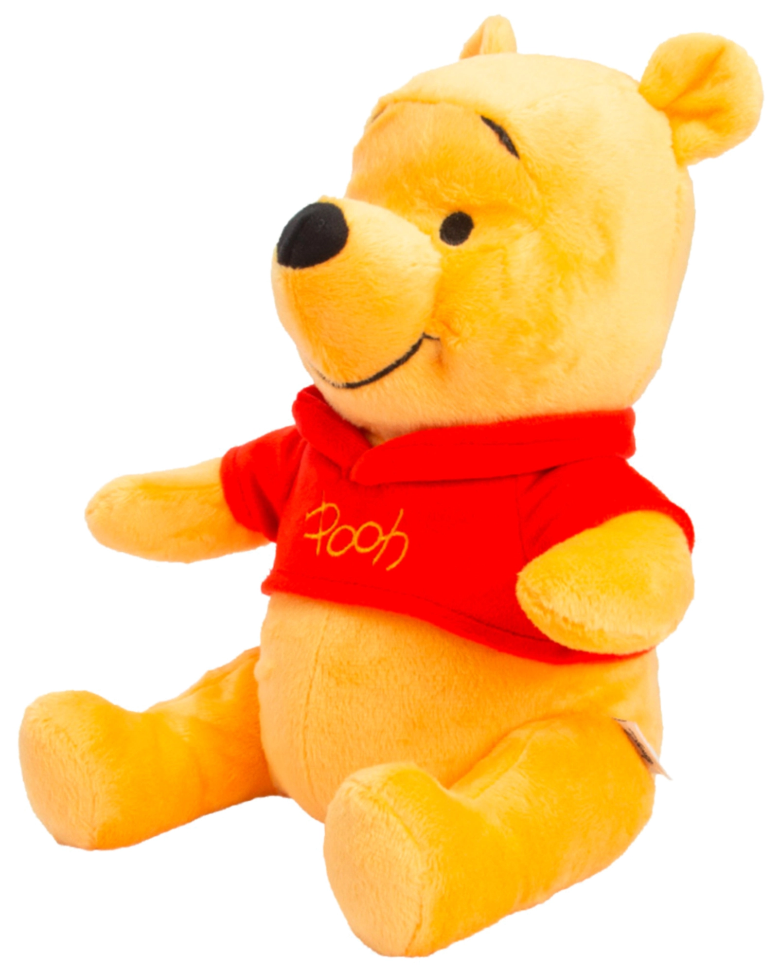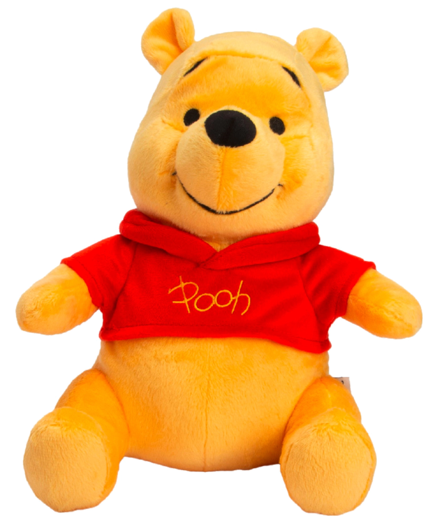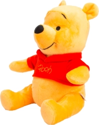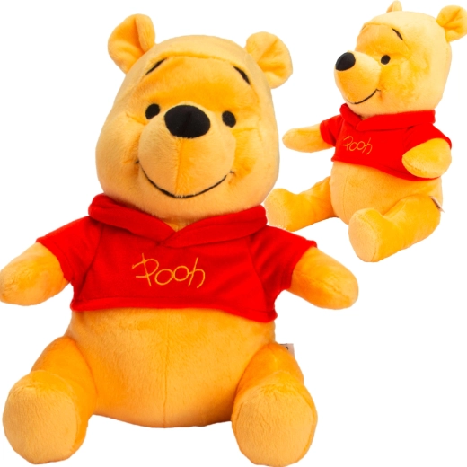 Pluszak sam siedzi, więc świetnie prezentuje się na półce. Czerwona koszulka z napisem „Pooh” podkreśla autentyczny wygląd postaci.