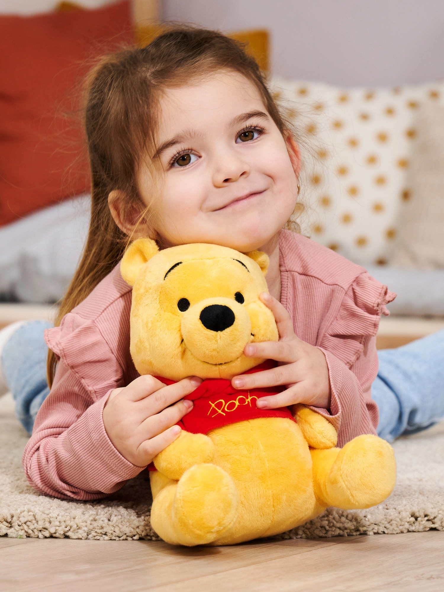 - Dopracowane detale – haftowane oczy i uśmiech, kultowa czerwona koszulka z napisem „Pooh”.
