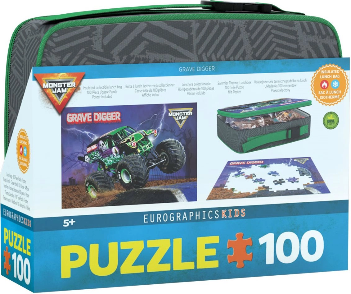 Ciesz się zabawą przy układaniu dynamicznego motywu GRAVE DIGGER MONSTER JAM. Puzzle marki EUROGRAPHICS przychodzą w specjalnym opakowaniu prezentowym – praktycznym izotermicznym pudełku śniadaniowym na zamek, które świetnie nadaje się do przenoszenia i dalszego wykorzystania.